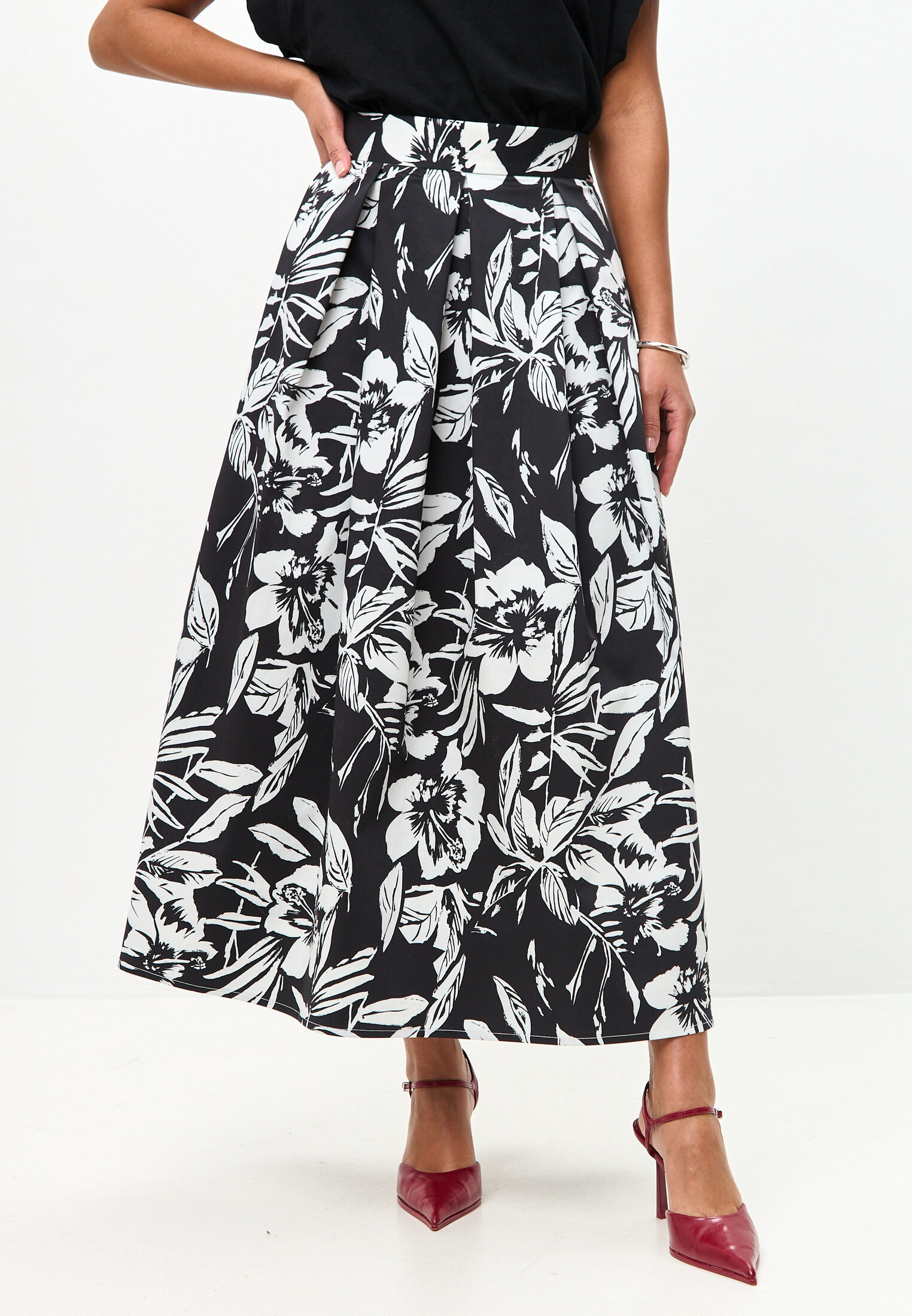 Длинная юбка в складку из плотного хлопка с цветочным принтом черно-белая