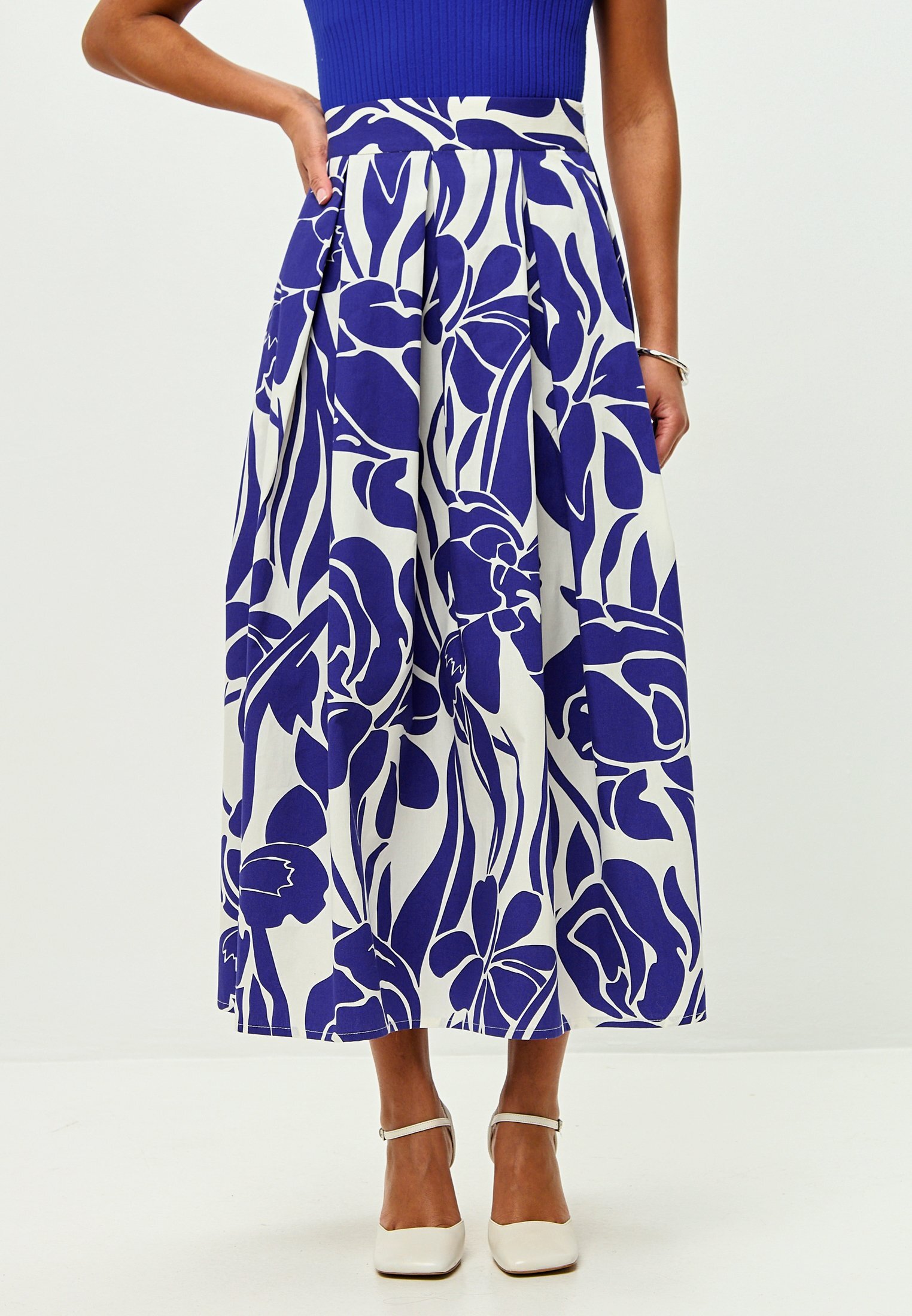 Длинная юбка в складку из плотного хлопка синяя с белым принт цветы