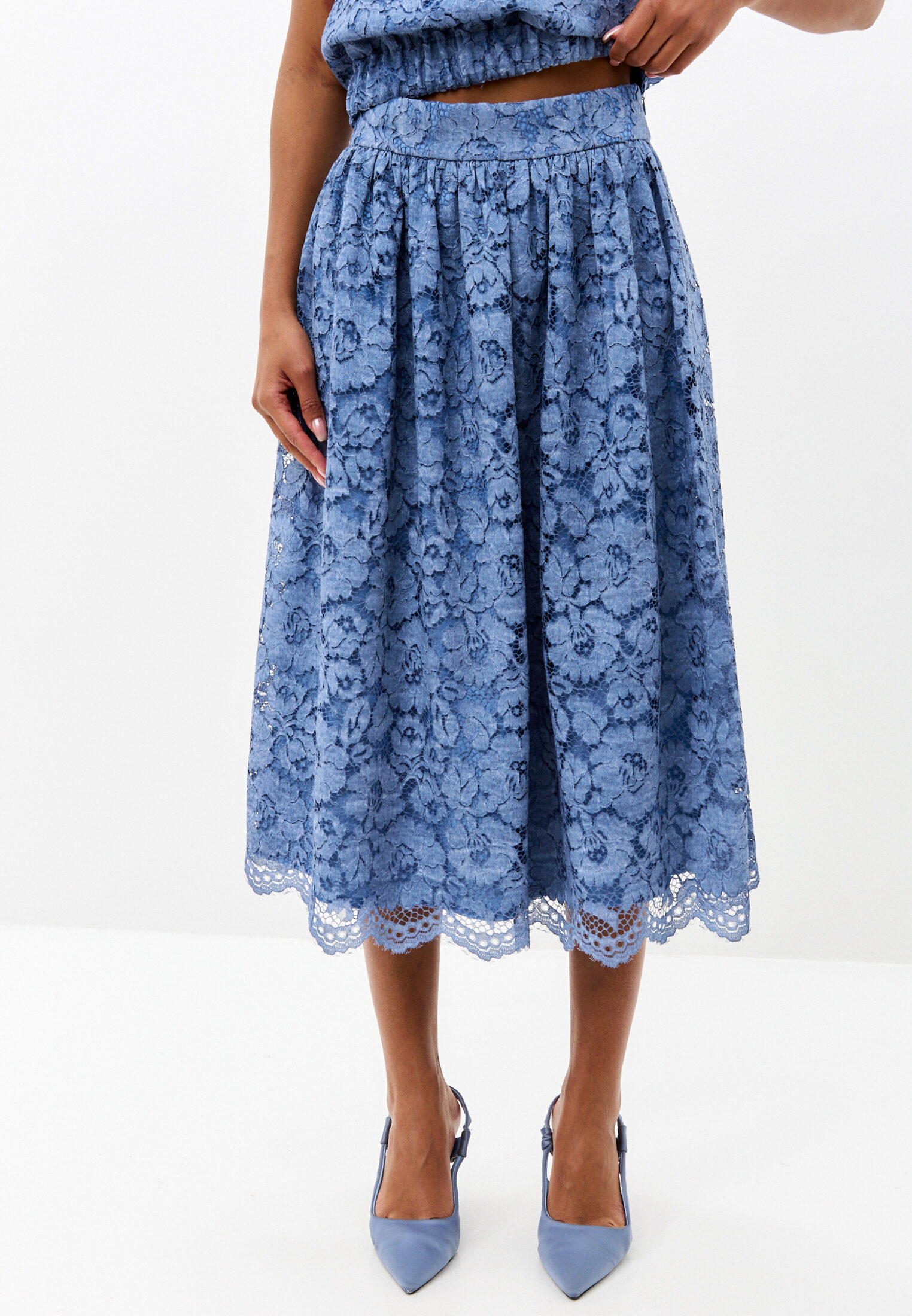 Юбка синяя средней длины из хлопкового кружева с поясом и с подъюбником